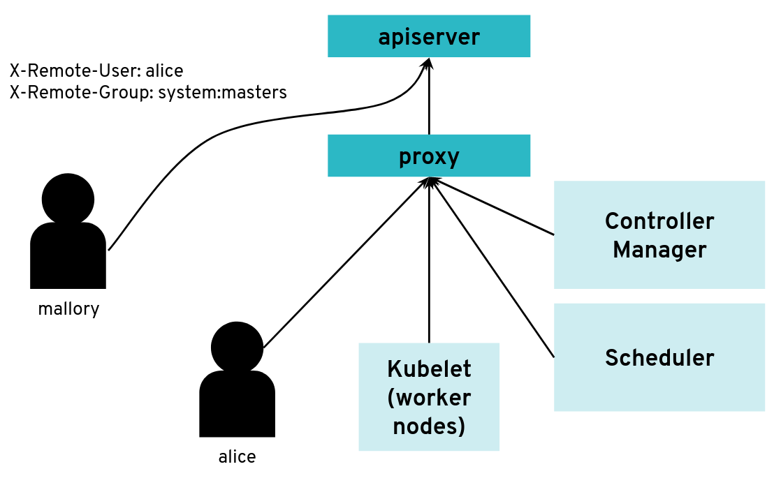 With a correct configuration, Mallory’s kubeconfig will have a certificate signed by the API server certificate authority but not signed by the proxy certificate authority. So the API server will not accept the extra HTTP header “X-Remote-Group: system:masters”.